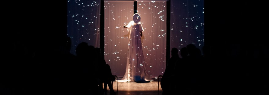 Vier lange, aufgespannte Tücher leuchten mir hell entgegen, als ich die Reithalle der Kaserne Basel betrete. Vor den weissen Flächen, gewissermassen als Teil der Leinwand und doch davon abgehoben, steht eine Person hoch und erhaben in einem weissen Kleid auf einem Podest. Sie trägt eine runde Maske vor dem Gesicht. Projektionsfläche und Akteurin in dieser Performance ist Koleka Putuma selbst: Während Videomaterial auf die Tücher und ihr Kleid projiziert wird, begleitet sie das Screening mit Gesten. Mal hebt sie mahnend den Zeigefinger, mal schweifen die Arme leicht umher, zum Schluss platziert sie die Maske auf dem Kopf – so wirkt sie wie ein Heiligenschein für die würdevolle Gestalt, die höher als alle im Raum steht.