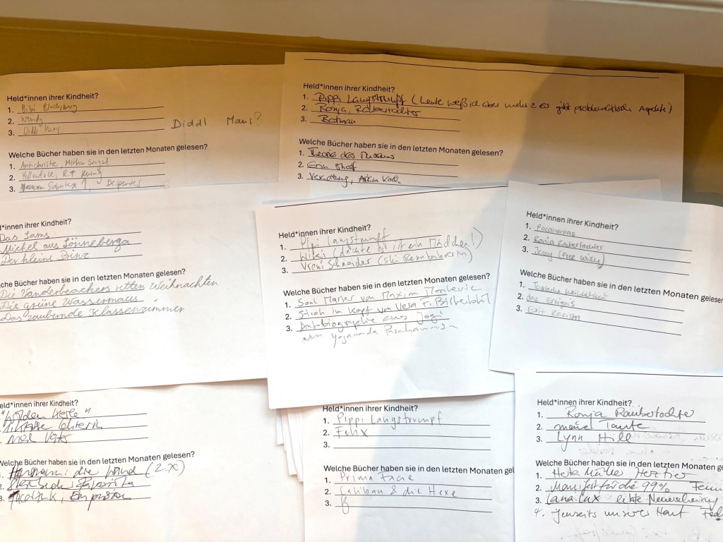Der Saal ist gefüllt, auf den Stühlen liegen Zettel mit Fragen ans Publikum: Wer sind die Held*innen Ihrer Kindheit? Welche Bücher haben Sie in den letzten Monaten gelesen? Die Antworten sind hier im Beitrag ganz unten mit aufgelistet.