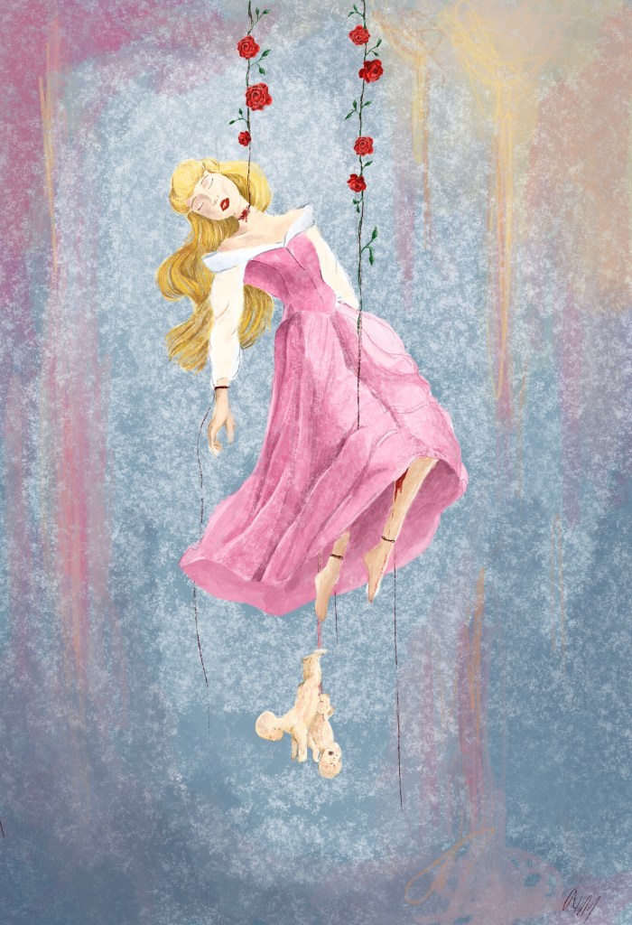 Die folgenden zwei Bilder greifen die schockierende Urfassung des Märchens «Dornröschen» auf: Anders als in der romantisierten Fassung, in der ein Prinz die schlafende Schönheit wachküsst – was aufgrund der Unmöglichkeit, Konsens einzuholen, bereits kritisch zu betrachten ist – wird in Giambattista Basiles Version «Sonne, Mond und Thalia» (17.Jahrhundert) das Motiv der Gewalt gegen Frauen offengelegt: Dornröschen wird im Schlaf von einem Prinzen vergewaltigt, wodurch sie noch im Schlaf Zwillinge zur Welt bringt. Eine Geschichte, die geprägt ist von schrecklichen Gewaltdarstellungen und patriarchaler Machtausübung. Es ist eine Erzählung, die erschreckend reale Parallelen aufweist. Denn leider ist diese Geschichte keine, die nur in alten Märchen existiert. Erst letztes Jahr kam heraus, dass Gisèle Pelicot jahrelang von ihrem Ehemann mit Medikamenten betäubt und von ihm sowie zahlreichen ihr unbekannten Männern vergewaltigt wurde, während sie bewusstlos war. Das so etwas überhaupt geschehen kann, zeigt wie tief verwurzelt die Gewalt gegen Frauen in unserer Gesellschaft noch immer ist.
