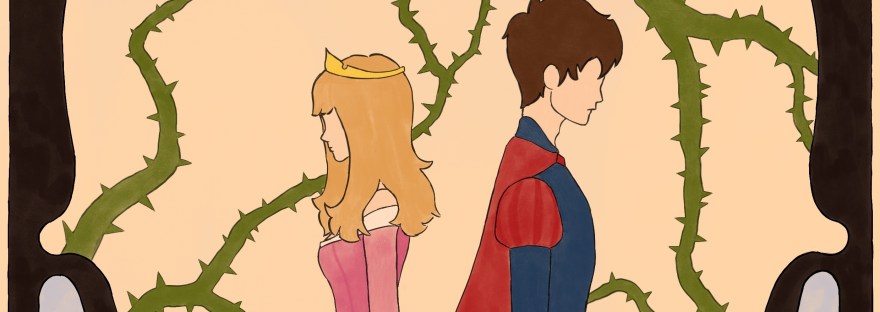 Die Dornen im Hintergrund symbolisieren die Verstrickung ihrer Rollen und wie sie in diesen feststecken. Doch beide entscheiden sich in diesem Bild für das Gegenteil. Sie wenden sich voneinander ab und lehnen damit nicht nur einander, sondern auch die ihnen zugeschriebenen Rollen ab. Dornröschen wird mit einer starken, entschlossenen Haltung dargestellt, die Standfestigkeit vermittelt. Prinz Phillip hingegen wirkt traurig – eine Emotion, die er zeigen kann, weil er seine Rolle als stets «starker Mann» ablehnt.