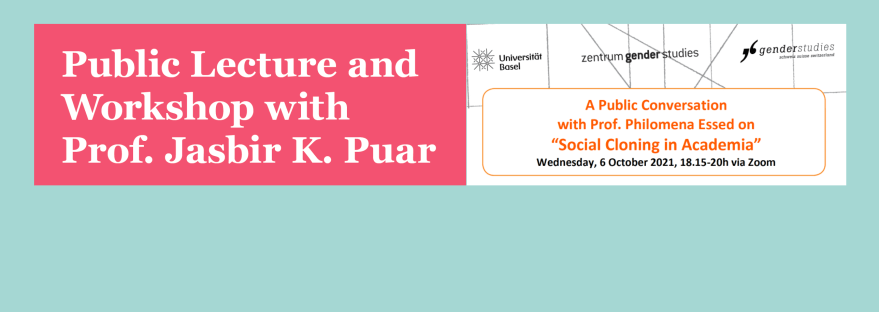 Gerne verweisen wir auf zwei spannende Programmpunkte am Zentrum Gender Studies, welche diese Woche stattfinden: Public Lecture and Workshop with Prof. Jasbir K. Puar Wann: 4.-6.10.2021Wo: online via zoomSprache: EnglischInformationen zur Anmeldung hier. Zum Programm-Flyer (PDF).Jasbir K. Puar is Professor and Graduate Director of Women’s and Gender Studies at Rutgers University. Her most recent book… Weiterlesen Veranstaltungen am Zentrum Gender Studies: Jasbir Puar und Philomena Essed
